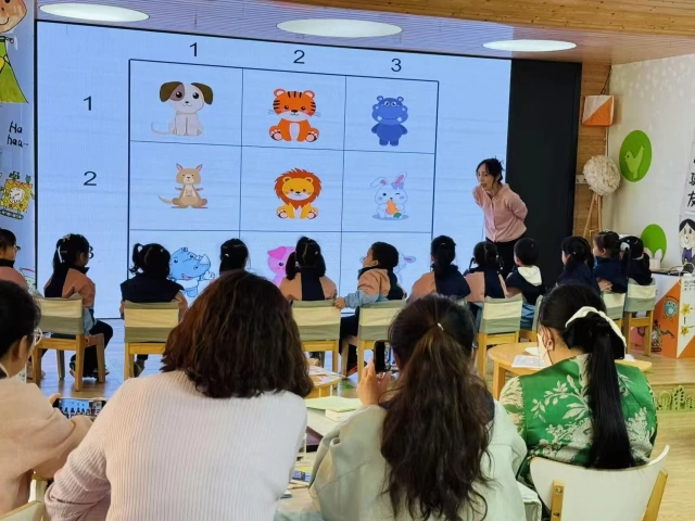 随后,老师们还观摩了课程。朝晖幼儿园老师王珺洁的中班《动物捉迷藏》,把九宫格变成“动物乐园”。以绘本为导入,让孩子们在“捉迷藏”的游戏中观察、记忆动物位置,并在九宫格中准确找出点标,有效提升了空间判断与位置记忆能力。