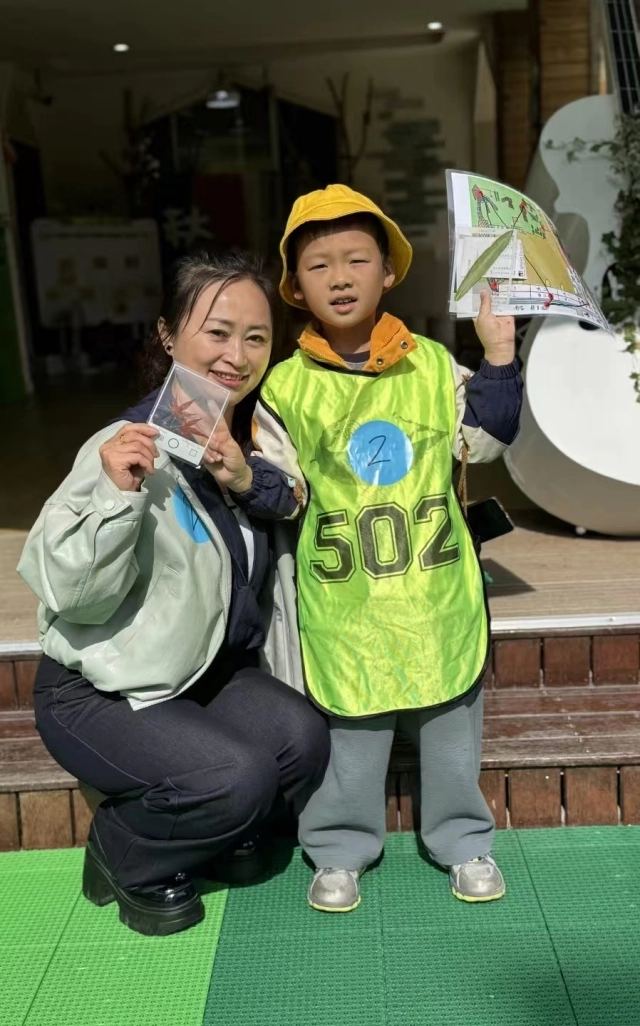 市集摊位上,摆满了孩子们提前用落叶、松果制作的手作:树叶书签、松果挂件、枫叶冰箱贴…… 阿克苏的老师手持“兑换券”,刚走近就被孩子们热情围住推销,“老师选这个!我这里有松果冰箱贴!”