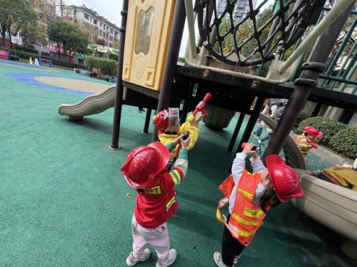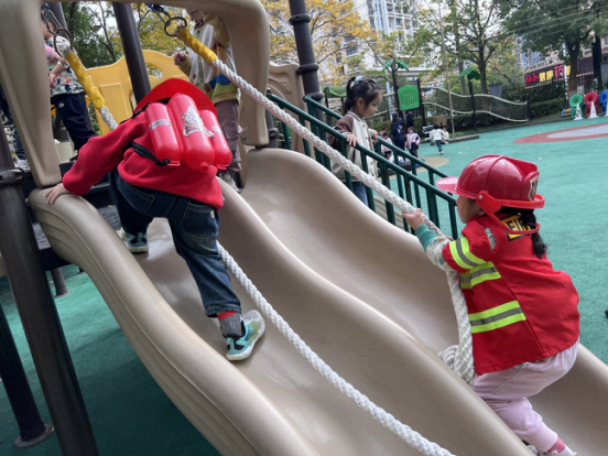 “小小消防员”户外游戏开始啦!孩子们穿越“火线”、攀爬“云梯”,在消防游戏中巩固消防知识,锻炼身体和勇气。在快乐的游戏中,安全的本领悄悄长在了宝贝们身上。