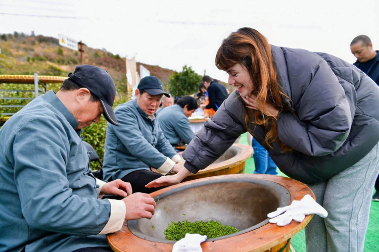 活动当天,东盘山的茶山上人头攒动。有拿着登山杖的徒步爱好者路过,有背着竹篓体验采摘的小朋友,有围着炒茶师傅看“铁砂掌”的外国友人,还有摄影爱好者们架起长枪短炮,等待云雾散开的瞬间。远处的海平面上,几艘货轮缓缓驶过。